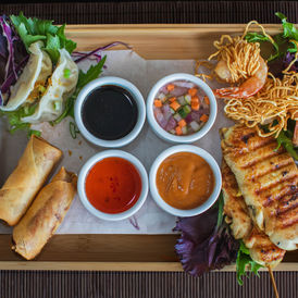 A combination set of spring rolls (2), dumplings (2), chicken satay (2), shrimp basket (2), served with variety sauce on the side.