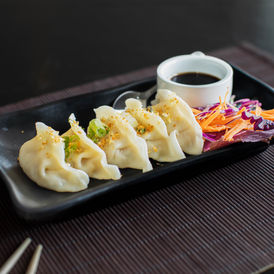 Steamed dumplings filled up with chicken and vegetables on top with crunchy garlic and scallion served with sweet soy sauce.